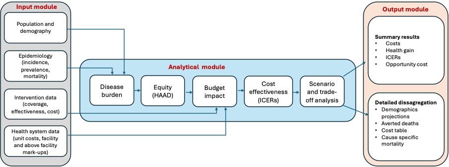 Intervention costs are taken from the literature and adjusted to different country settings. The demographic and epidemiological data identify the population in need of each intervention, which along with the coverage assumptions informs the estimates of aggregate costs.
