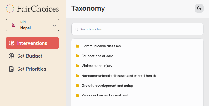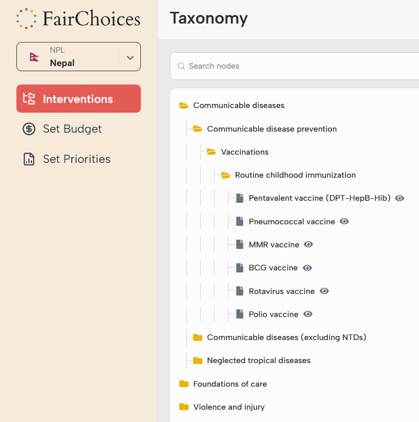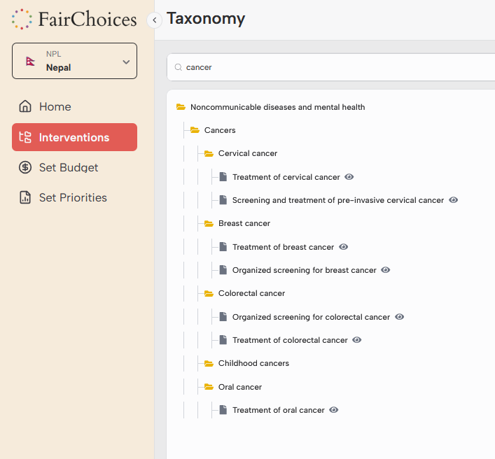 The Interventions section provides access to FairChoices’ comprehensive intervention taxonomy, organized according to the WHO UHC Compendium structure.