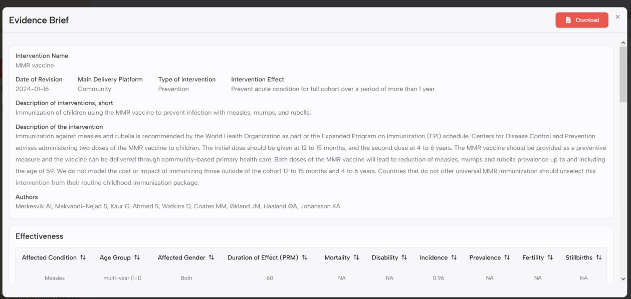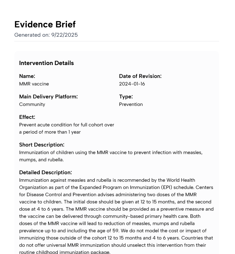 Access comprehensive data on intervention effectiveness, costs, and health impact based on peer-reviewed research and global health databases.