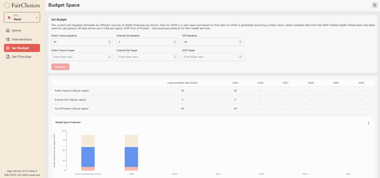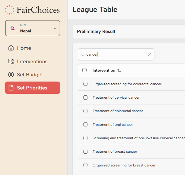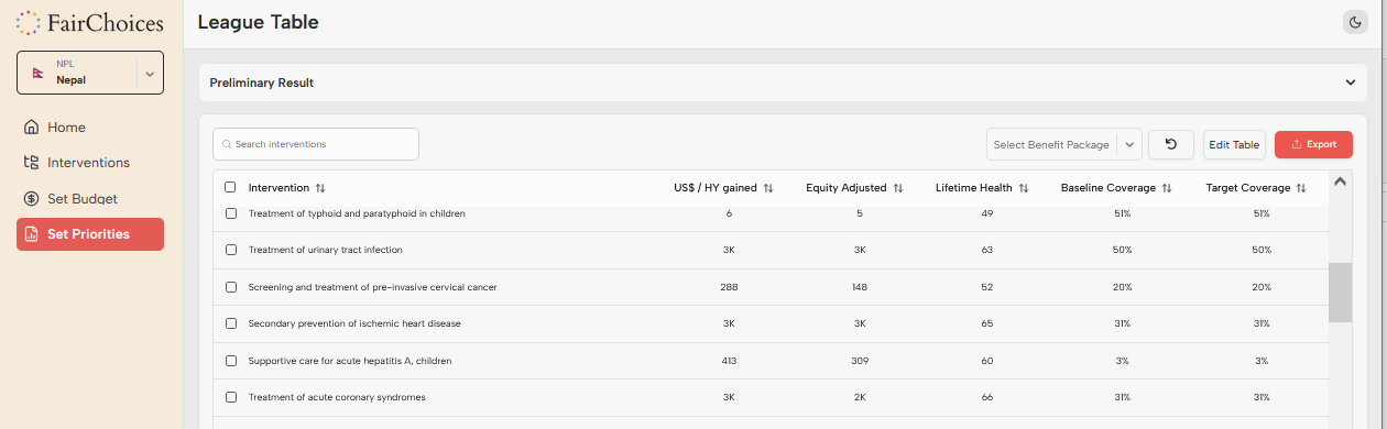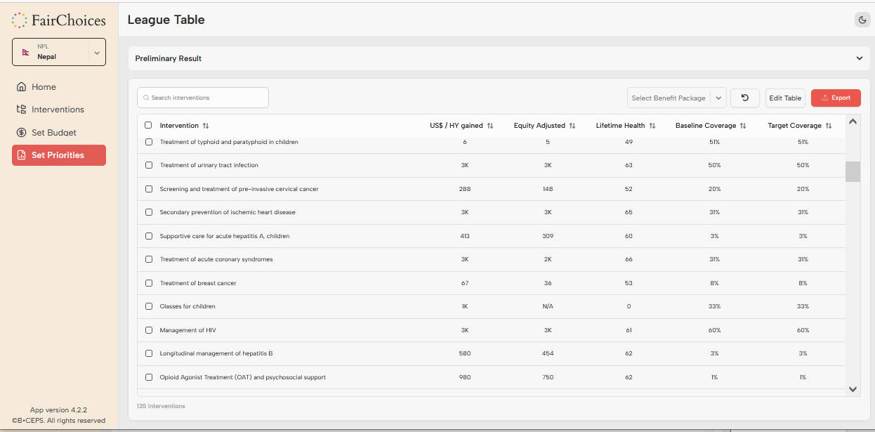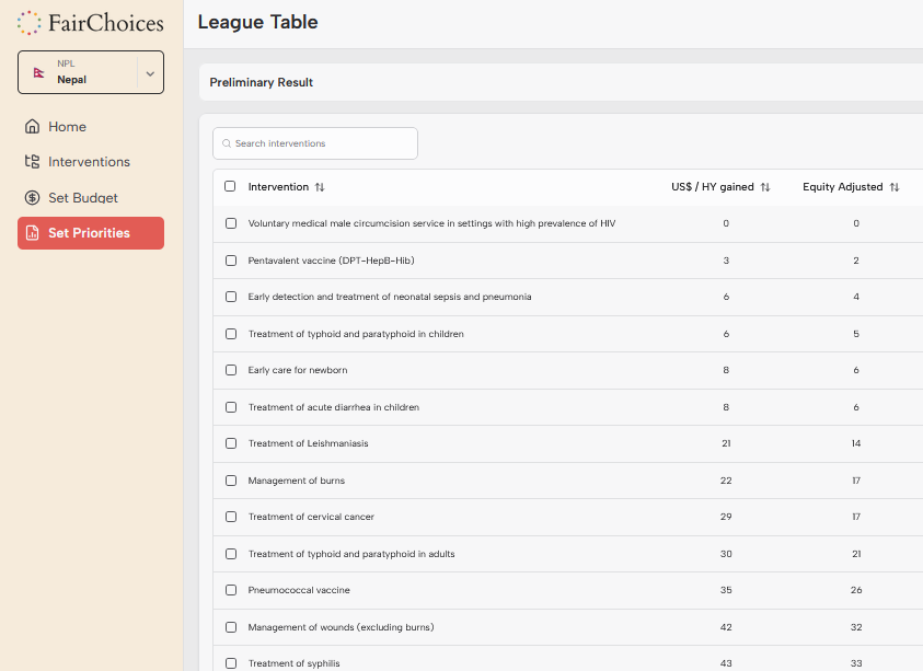 FairChoices is a decision-support platform designed to help policymakers design evidence-based health benefit packages. The tool provides comprehensive analysis of health interventions, cost-effectiveness data, and population health impact estimates.