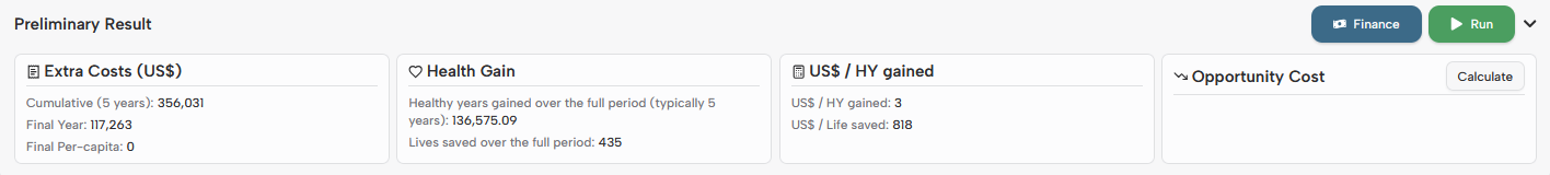 Next, click the mouse to the box to the left and fill in the percentage point increase that you would like to have as the target coverage for your selected health intervention in five years from now. In this example, the number is 6, because we want to estimate the costs and health gains following a 6% increase from 89% baseline coverage of the current year to 95% the target coverage in five years from now. When you have filled in the future upscaling using either Set Target (%) or Set Increase (%), you can estimate the financial costs and health gains that follows from the future upscale of the intervention by click the blue button with the white mark on it to the left of the box where you just filled in the number.To see preliminary estimates, click the at top right corner. Now you get some key estimates for the financial costs and health gains that follow from the upscaling of the selected health intervention(s):